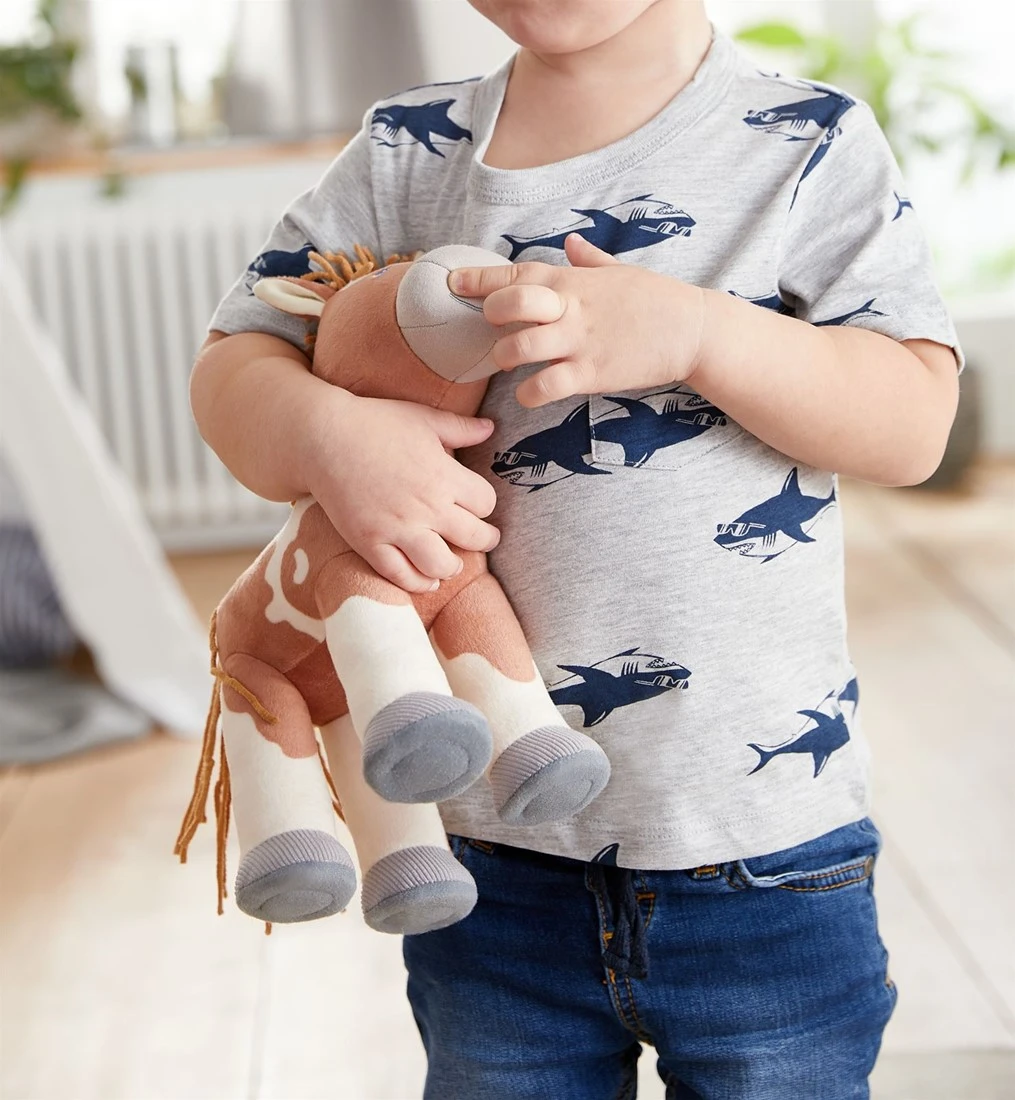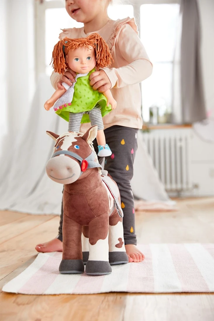 HABA Pferd Joey. Ăśber Stock und Stein und in den Sonnenuntergang hinein – mit Joey erleben kleine Pferdefreunde die schönsten Abenteuer. Körper wattiert, Mähne und Schweif aus Chenille, FĂĽĂźe aus Cord.